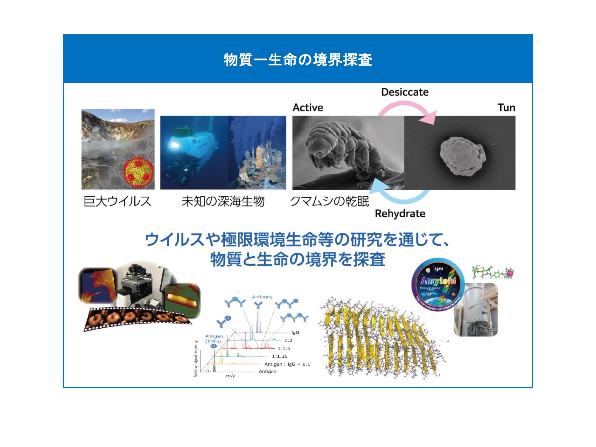 生命機能を維持するために必要となる、本質的あるいは最小の機構や原理を解き明かすために、極限環境に生きる生物、ウイルス等における生物間相互作用や環境応答に関する分子複合体の形態・機能・動態を観測し、物質-生命の境界の体系的理解を目指す。