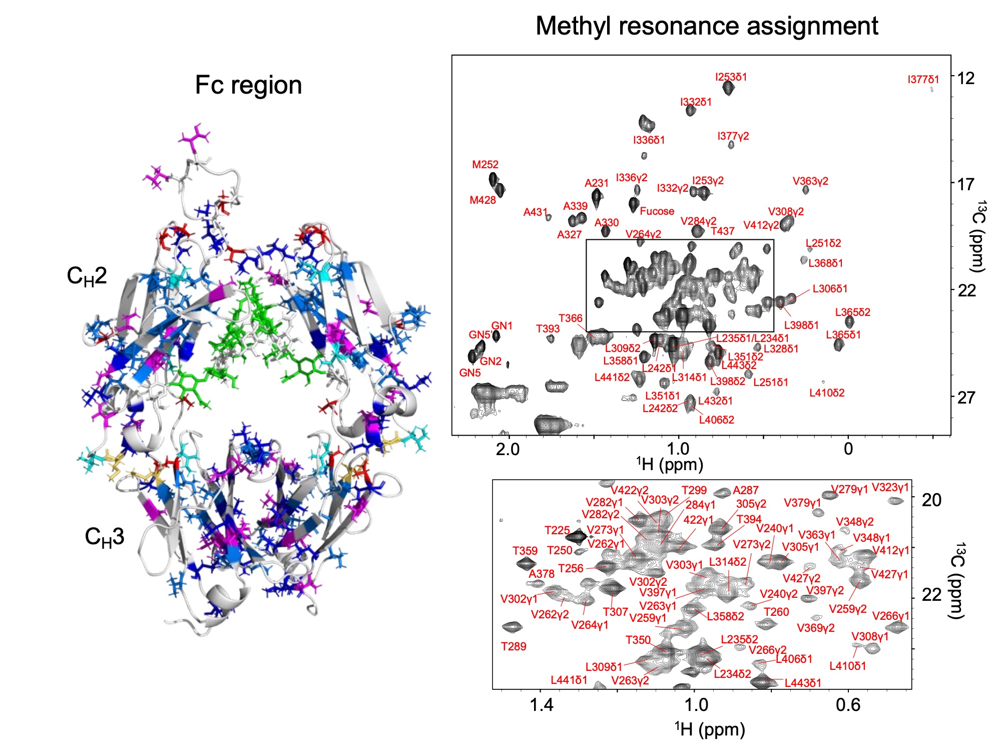 The researchers combined amino-acid-selective isotope labeling, mutagenesis, and multidimensional NMR experiments to assign methyl resonances from multiple residues—including alanine, isoleucine, leucine, methionine, threonine, and valine—in the Fc domain.