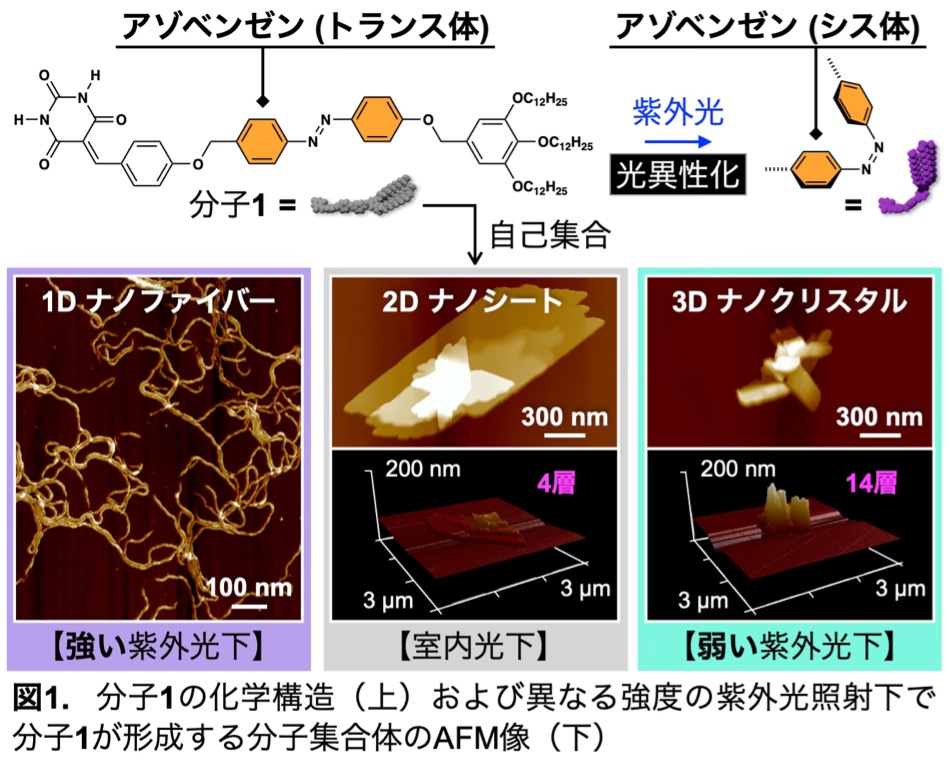研究チームは、フォトクロミック分子の構造変化(光異性化注4))と、分子集合体の構造多様性(超分子多形注5))を組み合わせることで、照射する光の強度によって異なる次元性を持つ3種類の集合構造(一次元ナノファイバー、二次元ナノシート、および三次元ナノクリスタル)を作り分けることに成功しました(図1)。