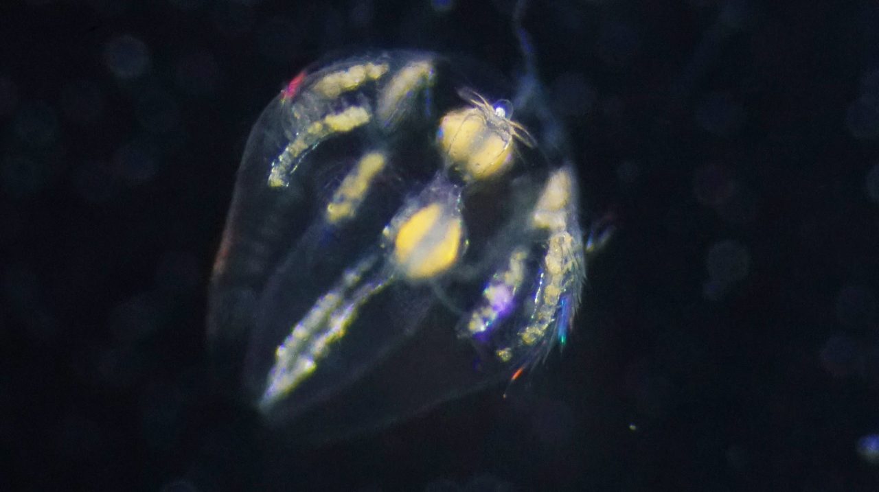 クシクラゲの幼生の写真。右上で白っぽく光って見える小さな丸いかたまりが平衡器にある平衡石。