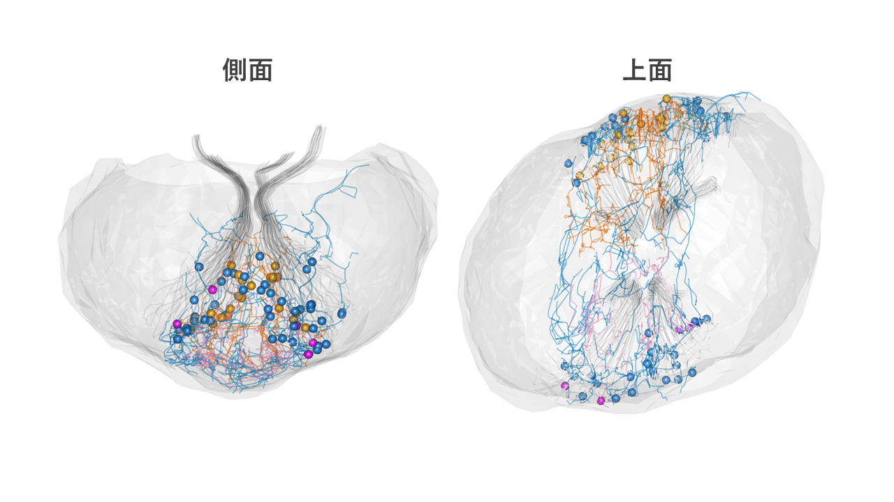 図3.3つの神経細胞(青、マゼンダ、黄色)が形成する複雑な神経ネットワーク。各神経細胞からバランサー細胞(灰色)へ投射するシナプスの位置を、球で示している。