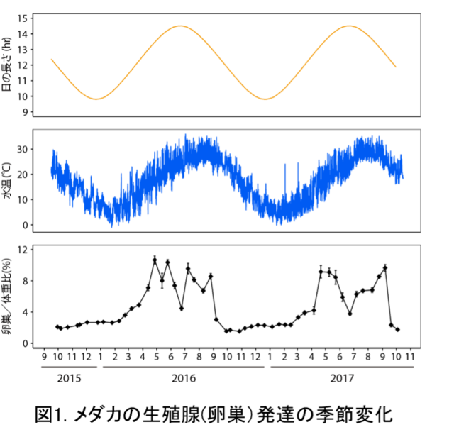 青森県から沖縄県まで、日本各地に生息するメダカは古くから日本人に馴染み深い魚です。私たちはこれまでの研究で、メダカの繁殖活動や色覚、行動などが、季節によって顕著に変化することを報告してきました(Nature Commun 2013, Nature Ecol Evol 2019, PNAS 2020など)。今回、私たちはメダカを屋外の自然条件下で2年間にわたって飼育し、生殖腺(卵巣)の発達の経時的な変化を観察したところ、メスのメダカの卵巣が毎年、4月、5月に発達し、梅雨の時期に一度退縮した後、再び7月、8月に発達するという明瞭なリズムを示すことを見出しました(図1)。