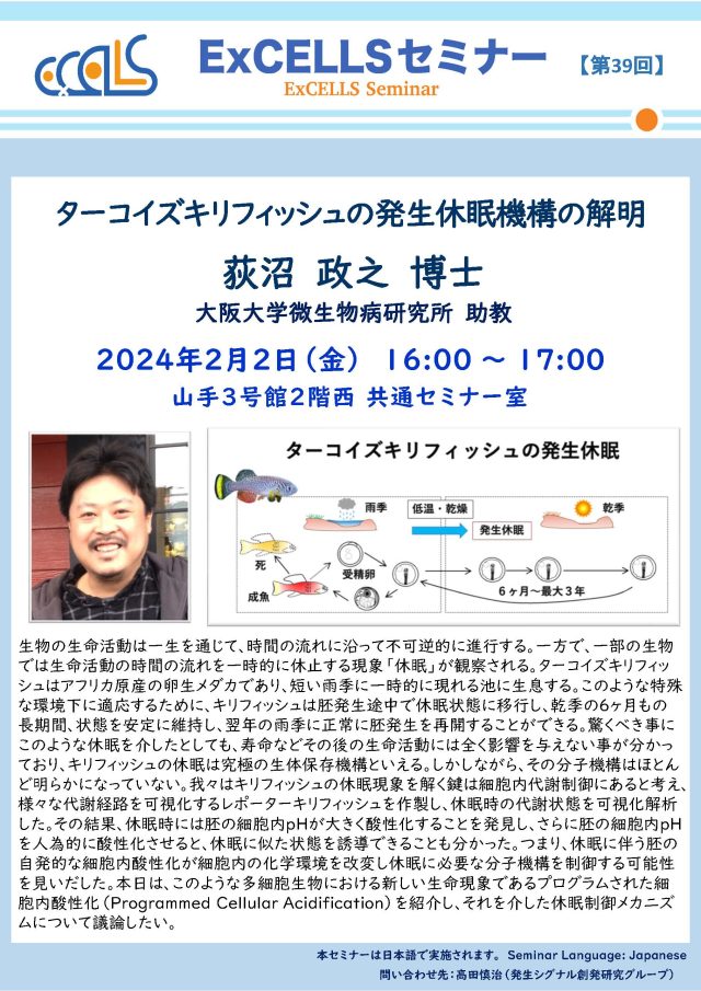 多細胞生命は受精してから、発生し、成長し、そして老化して死に至る。私の研究室では、このような生命の一連の時間変化を支える、未知の組織恒常性維持機構を暴き出し、それをヒトのバイオロジーの理解と制御に繋げることを目指している。その実現のために、生命現象に真正面から向き合うことで独自の仮説を立案すること、モデル生物の特徴を最大限に活かした独自のアプローチ、医工学分野との連携、この3つを重視して研究を進めている。本セミナーの前半では、イメージングに適した小型魚類ゼブラフィッシュを利用したin vivo細胞生物学により見出した「化学-力学シグナルの相互変換を介したモルフォゲン勾配の頑強性維持機構」をご紹介したい。また、後半では、新たな老化モデルである超速成長・超速老化魚ターコイズキリフィッシュとマルチオミクス・データ解析を利用した「健康寿命の合成生物学」についてご紹介したい。